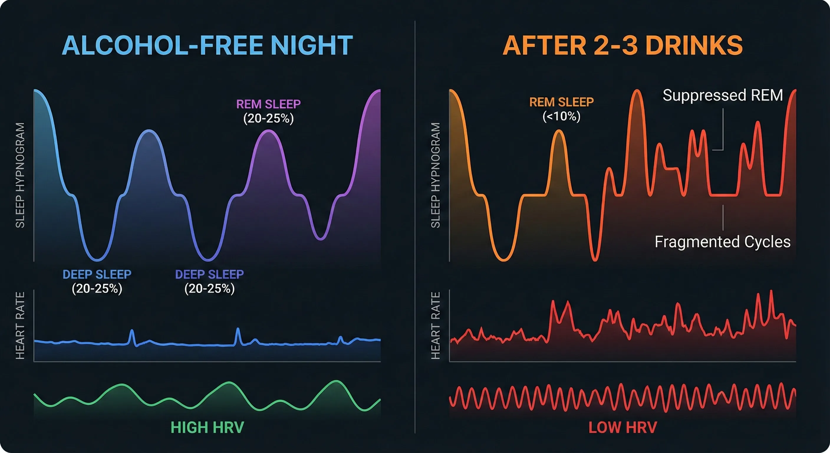 - HRV is suppressed by 15-20% after 2-3 drinks, taking 24-48 hours to recover