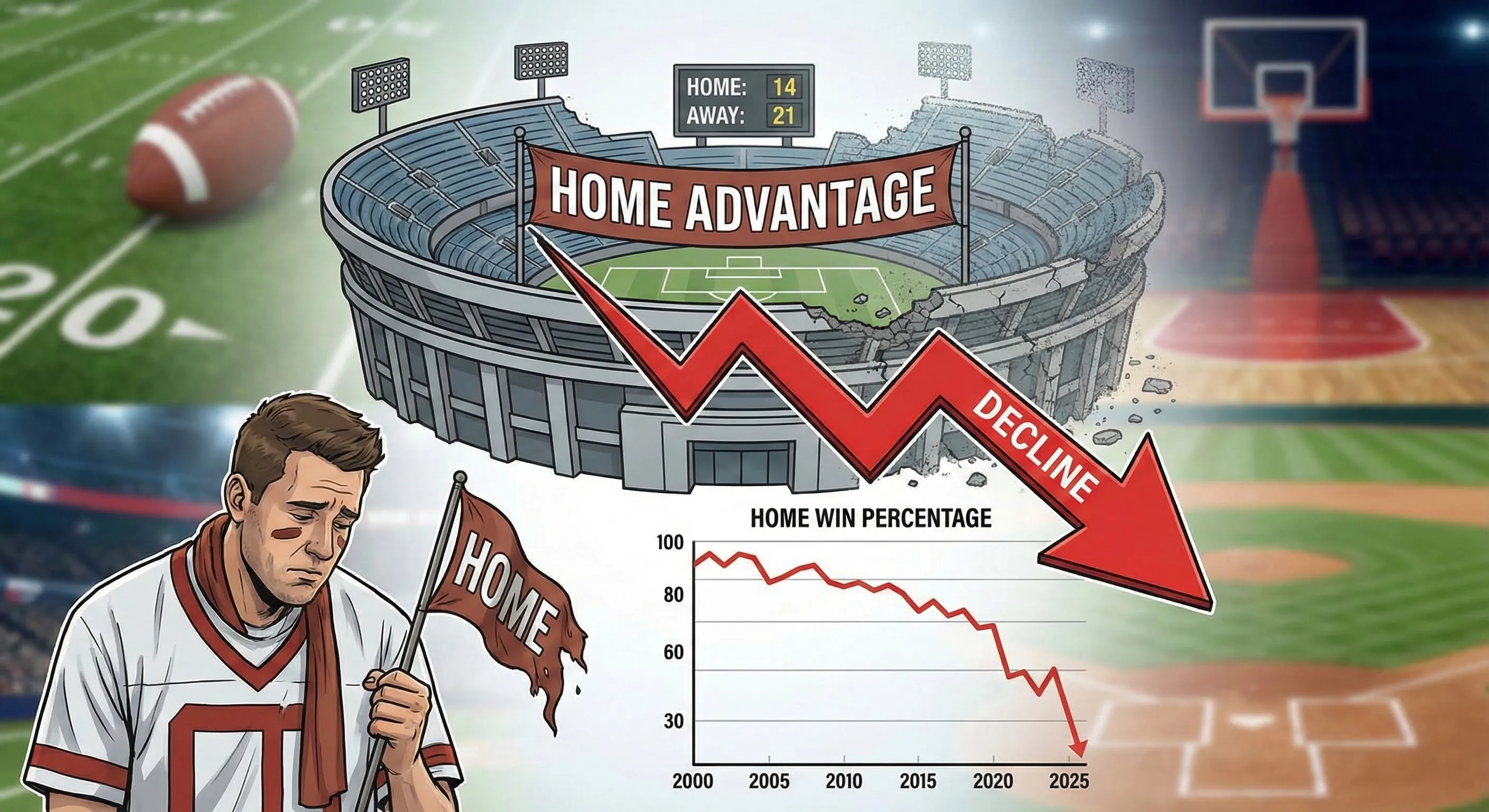 Home-field advantage has been a fundamental assumption in sports forever. Teams historically win 54-60% of home games across major leagues. Crowd energy, familiar surroundings, and lack of travel fatigue supposedly give home teams an edge. Except that advantage is shrinking. Across the NFL, NBA, MLB, NHL, and European soccer leagues, home winning percentages have declined 3-7 points over the past decade.